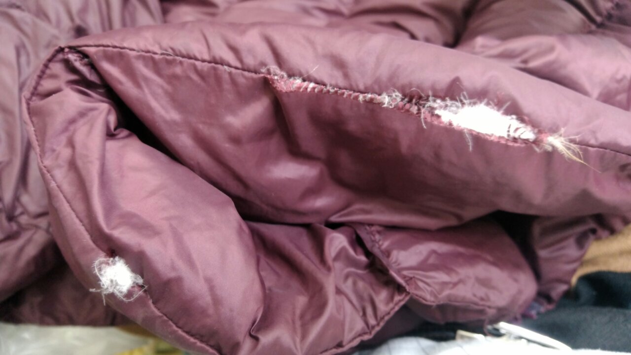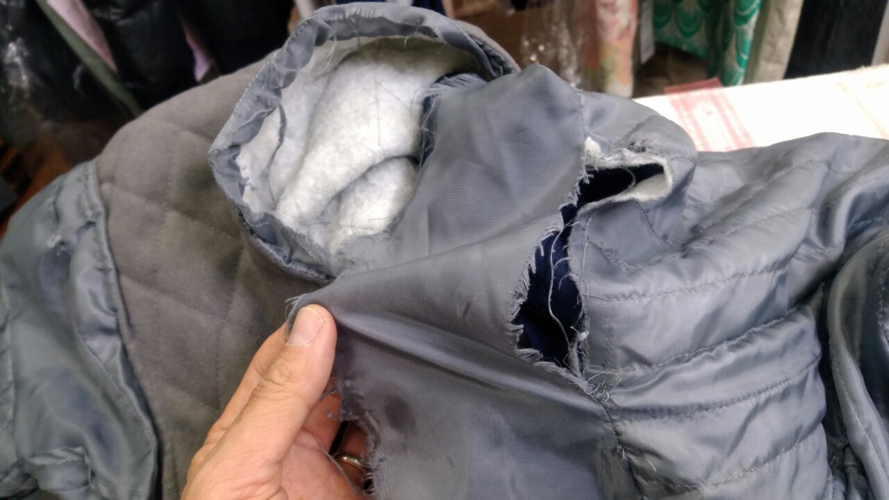 クリーニング業界の繁忙期になると毎日このような裏側の裂け、表地の裂け、縫い目の裂け、クリーニング業界と多くの接点がある当方にはたくさん集まります。その中でも悲惨なのはやはりダウン爆発!